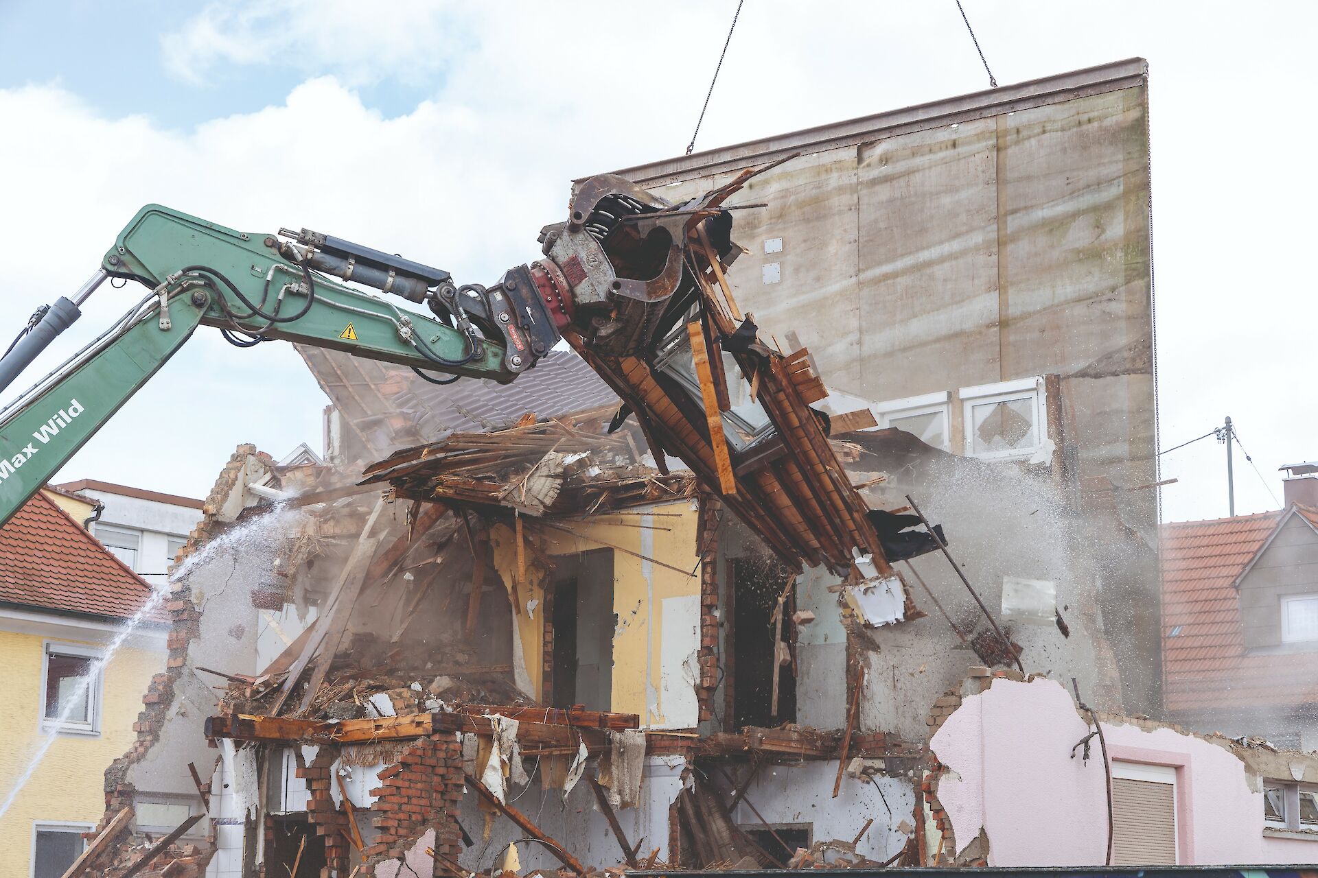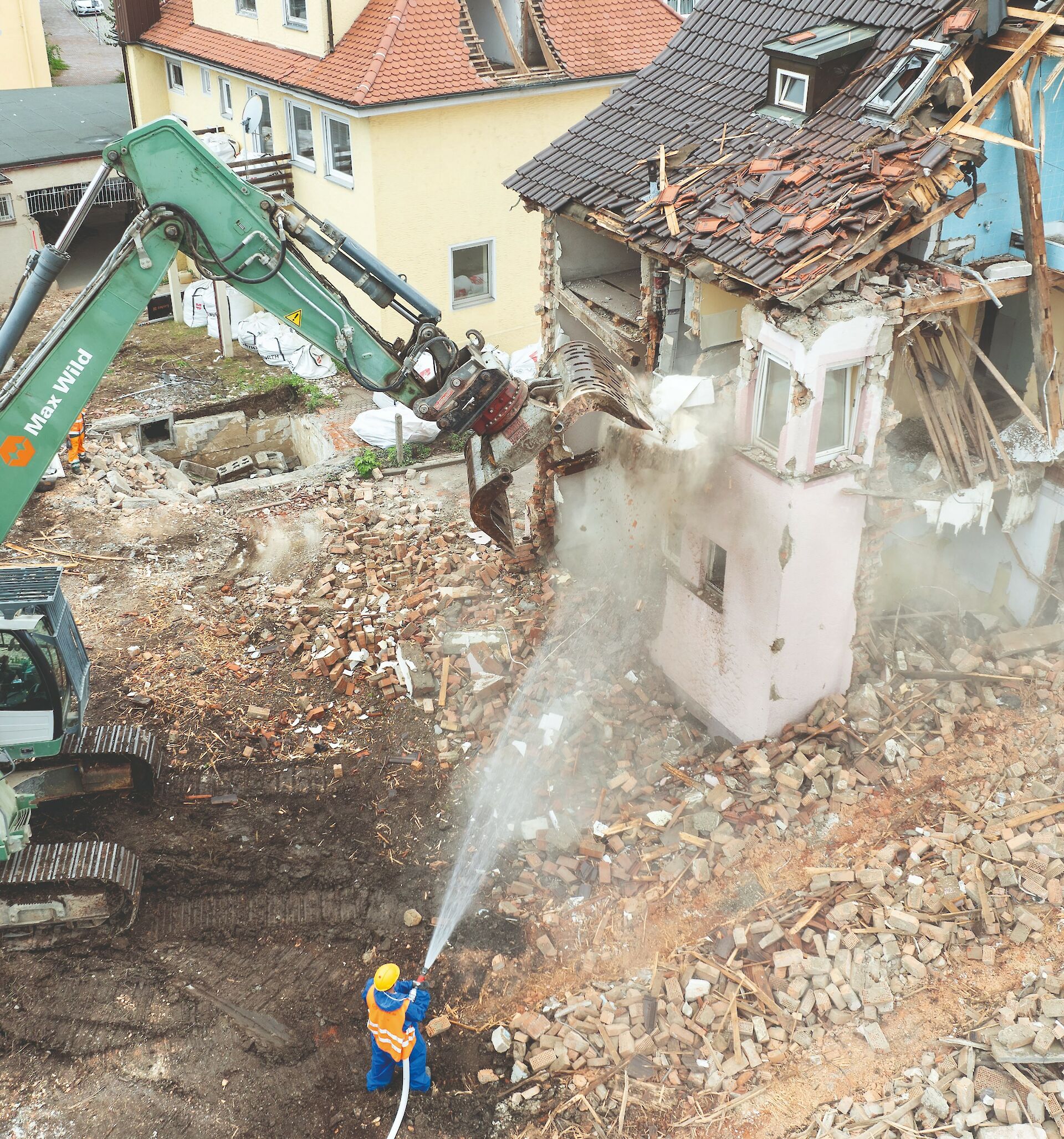 - Als Schutzmaßnahme für den öffentlichen Raum kam ein Abbruchvorhang zum Einsatz, da sich die Gebäude unmittelbar in der Nähe eines Kreisverkehrs befanden. Die Straße konnte nicht umgeleitet werden, weil es sonst zu hohen Beeinträchtigungen des Straßenverkehrs geführt hätte.