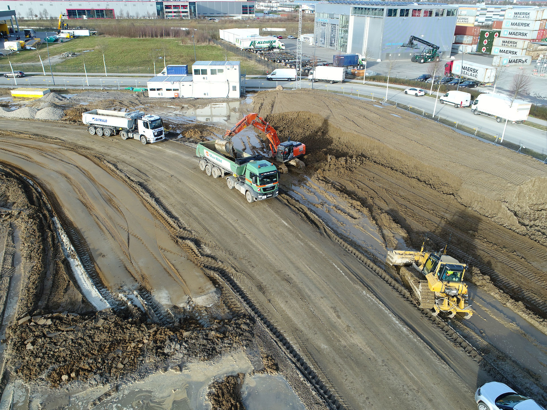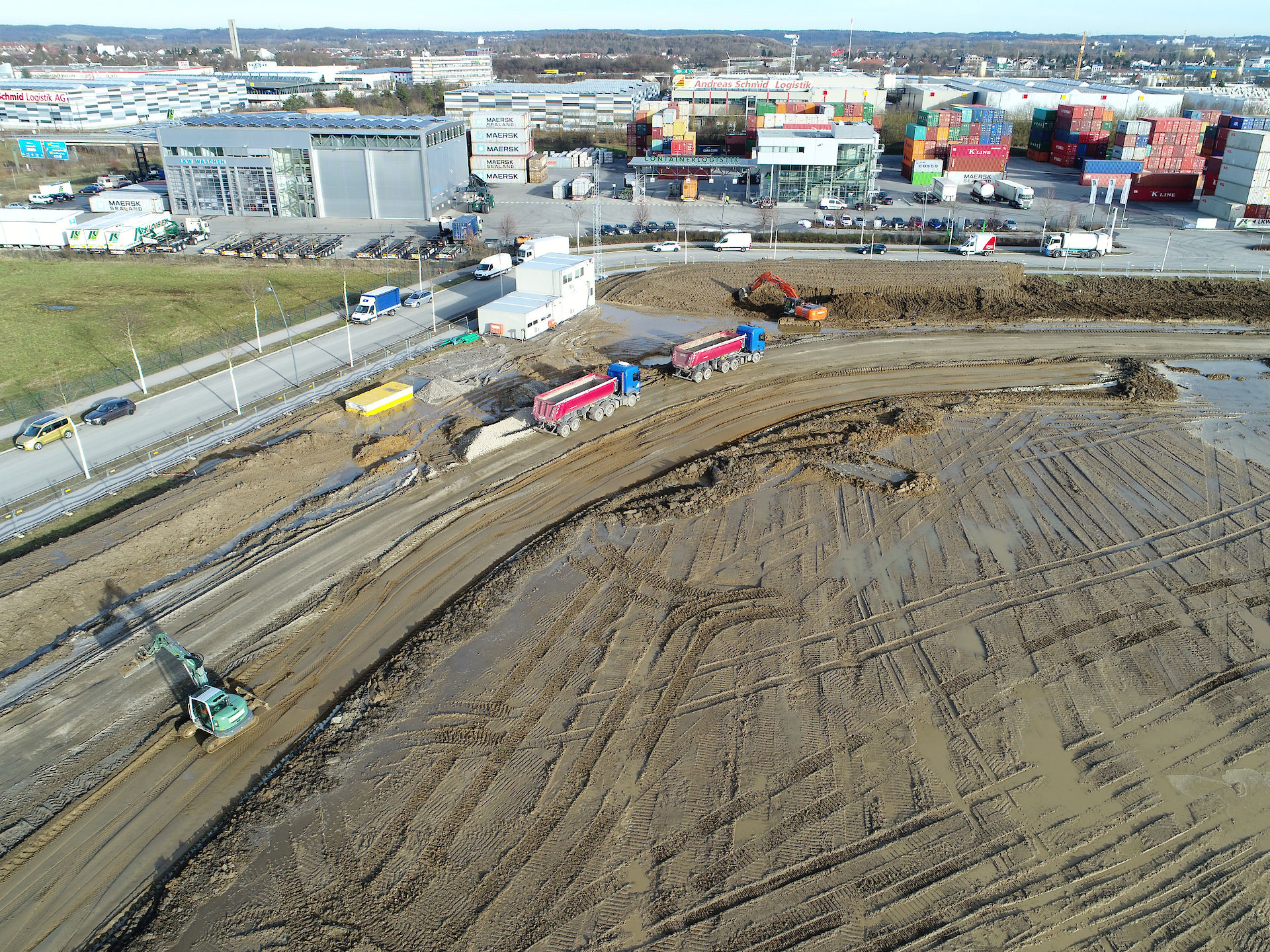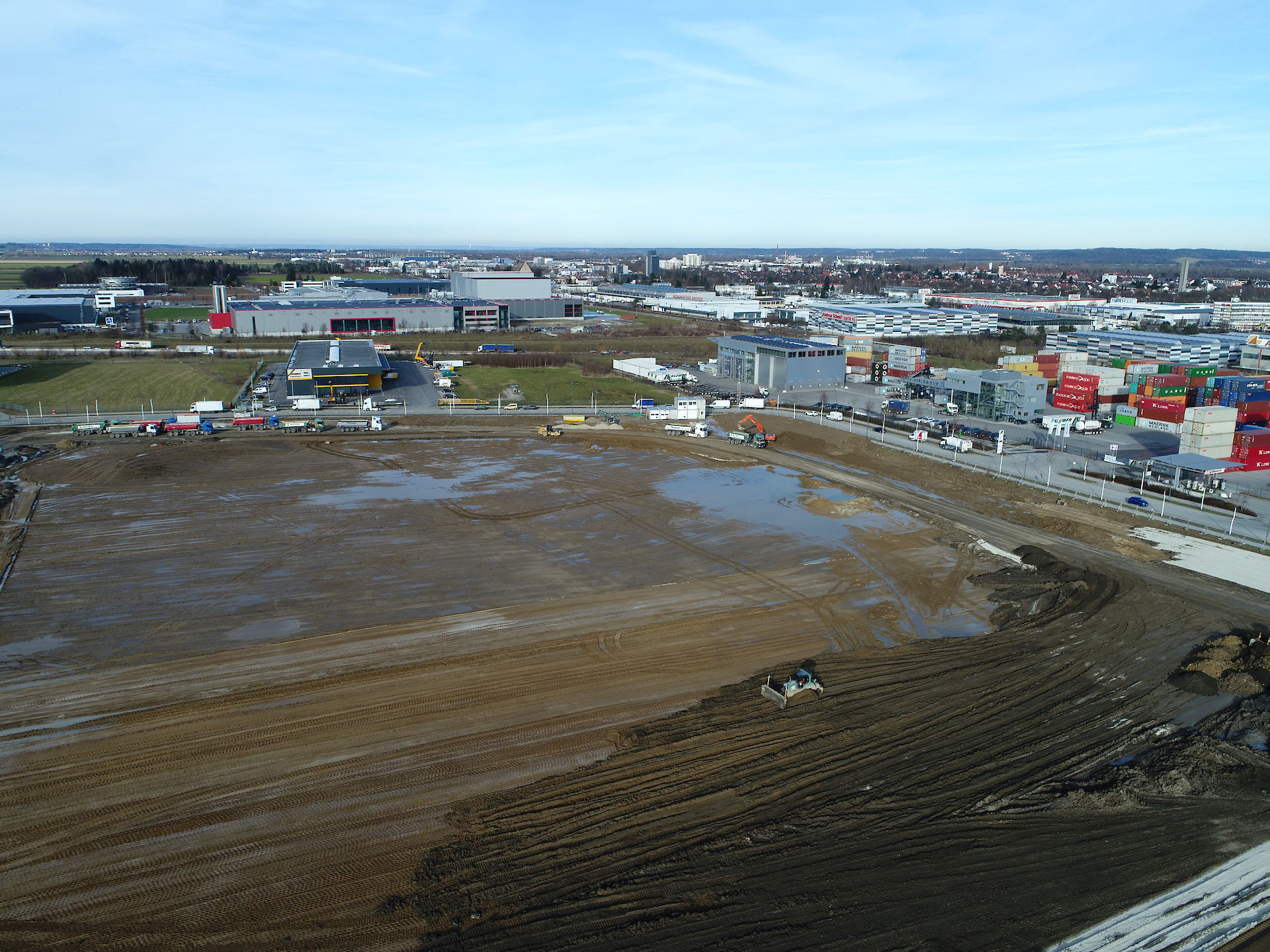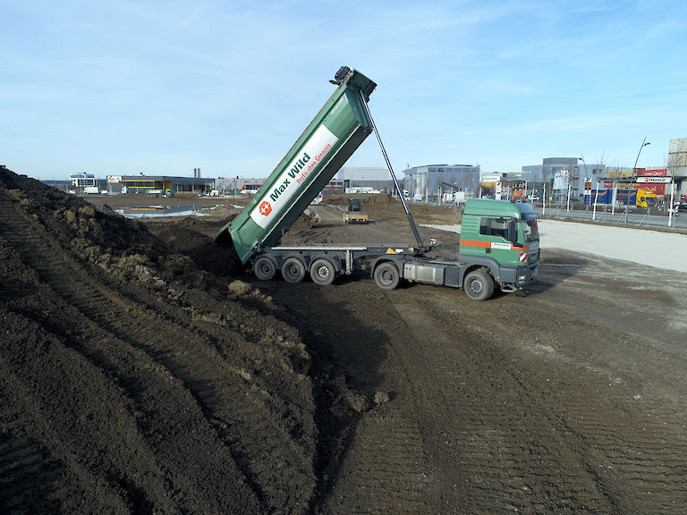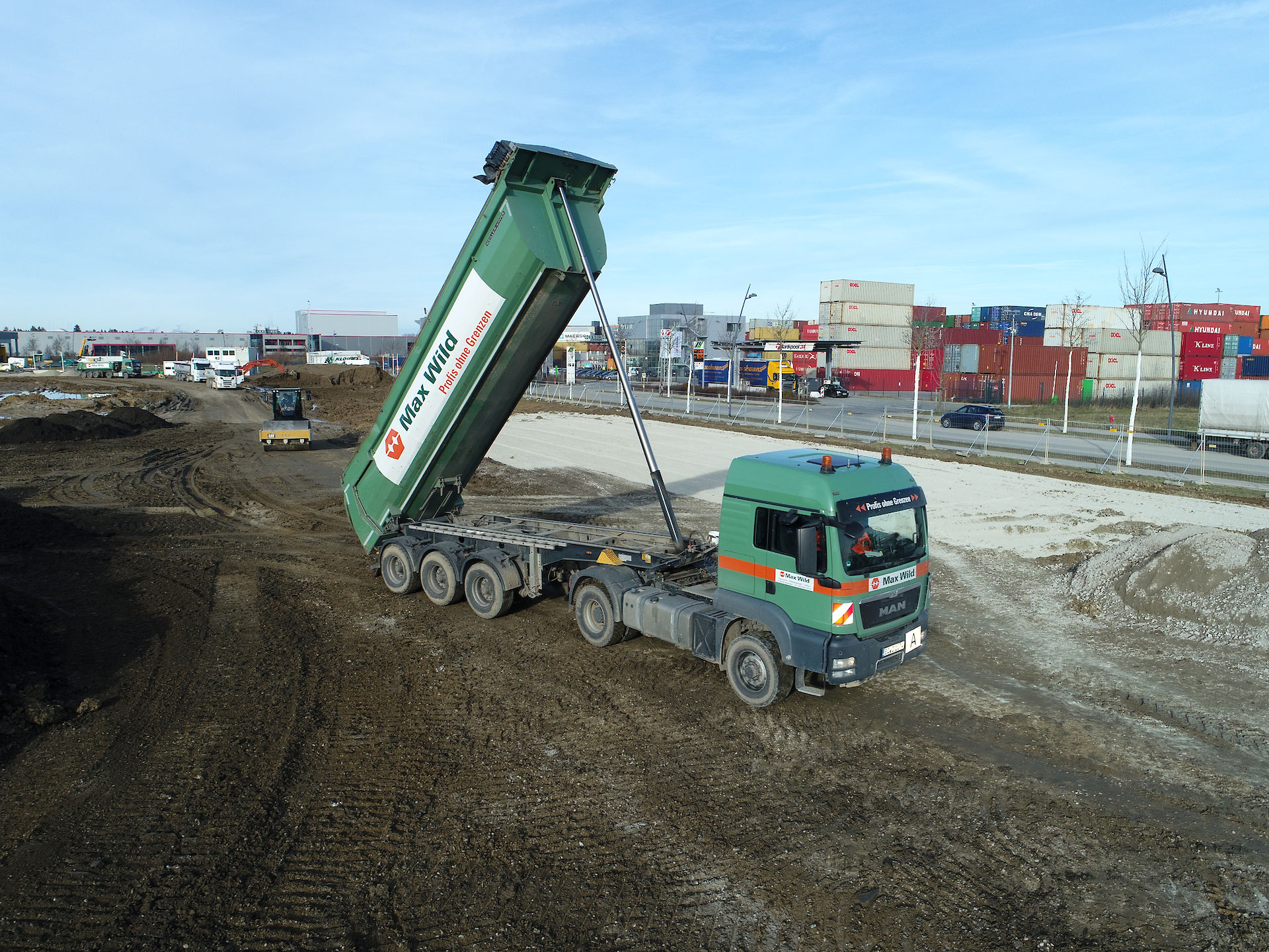 Seit Mitte Dezember 2017 bearbeiten die Tiefbauspezialisten der Firma Max Wild das 6 Hektar große Grundstück in Gersthofen. Im Rahmen des Projekts gilt es insgesamt bis zu 30.000 Tonnen Humus abzutragen und abzufahren und circa 120.000 Tonnen Auffüllmaterial anzuliefern und einzubauen. Aktuell schreiten die Bauarbeiten trotz schwieriger Witterung zügig voran. Zunächst wurden die Erdmassen durch zwei Raupenbagger, zwei Schubraupen, Wirtgenfräse, Traktor mit Streuer sowie zwei Walzenzüge in Bewegung gebracht und abgetragen. Dabei fallen täglich bis zu 1.000 Tonnen Humus an, die von einem Kettenbagger mit einem Einsatzgewicht von 30 Tonnen auf die Lkw geladen werden. Täglich kommen beim Transport des Materials 50 bis 70 Lkw zum Einsatz. An der Erddeponie angekommen, wird die Ladung abgeladen und das für die Baustelle benötigte Auffüllmaterial auf die Lkw geladen. Eine besondere logistische Herausforderung sei, laut Bauleiter Locher, die Steuerung der Anlieferung und des Einbaus des Materials: „Täglich erwarten wir bis zu 4.000 Tonnen Materialanlieferungen. Bis Ende März sind das insgesamt 120.000 Tonnen Auffüllmaterial, die zur Baustelle gebracht und qualifiziert eingebaut werden, um nach erfolgtem Humusabtrag das Gelände auf die geplante Höhe zu bringen“, so Locher. Das ist allerdings nicht die einzige Besonderheit bei dem Projekt: Hinzu kommen die örtlichen Gegebenheiten der Baustelle. Mehrere am Bau beteiligte Gewerke arbeiten gleichzeitig auf dem Areal. Dies erfordert viel Abstimmung untereinander und festgelegte logistische Prozessabläufe, damit gewisse Bauabläufe reibungslos und ungehindert fortgeführt werden können. Mit im Leistungsumfang befinden sich Kanal- und Außenanlagenarbeiten. Die Verlegung der circa 2.500 Meter Kanalrohre DN 100 bis DN 800 startet voraussichtlich Mitte Februar 2018. Zwischen Baubeginn und Fertigstellung der Arbeiten durch die Firma Max Wild ist ein Zeitraum von sieben Monaten vorgesehen.