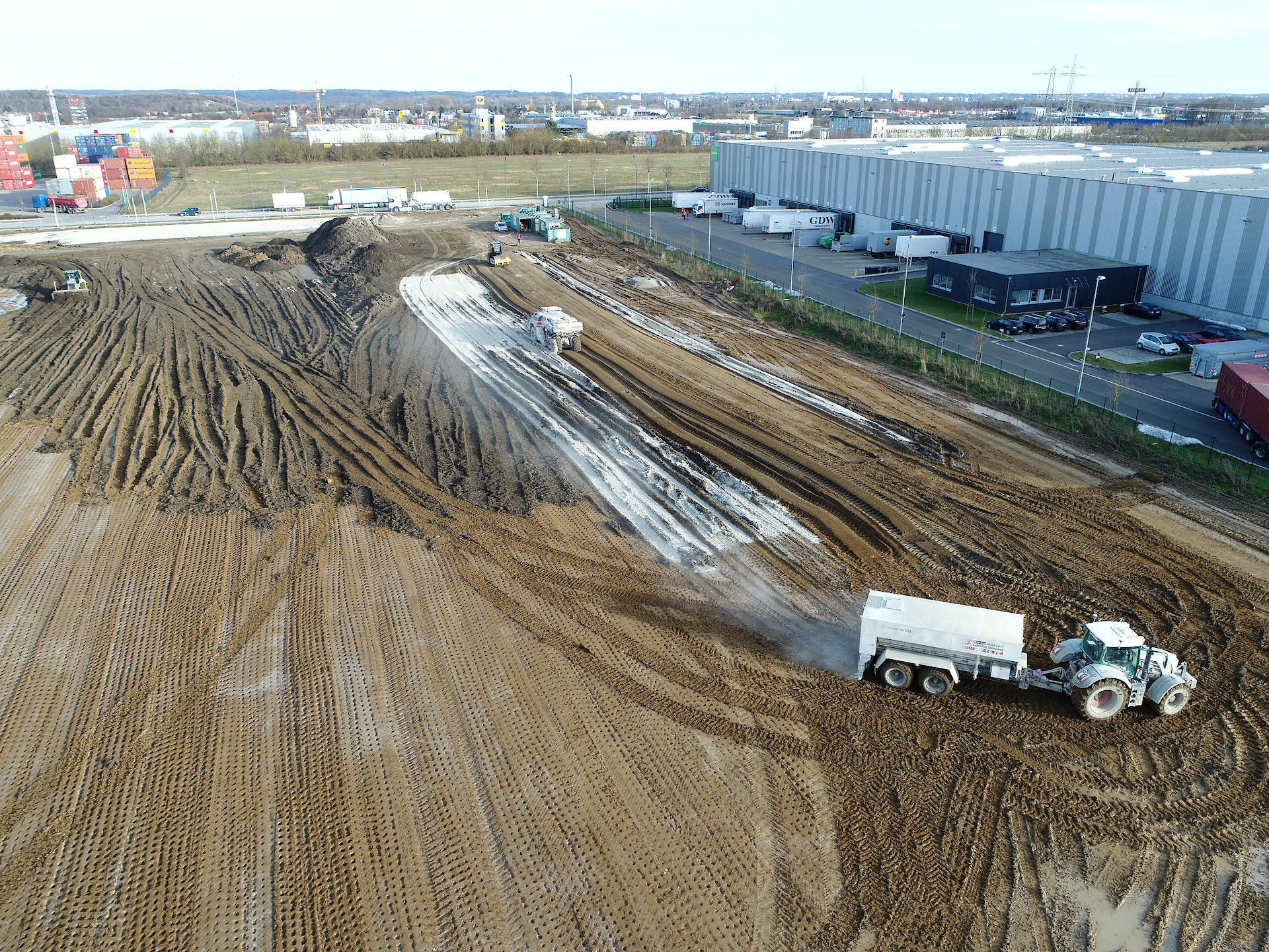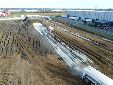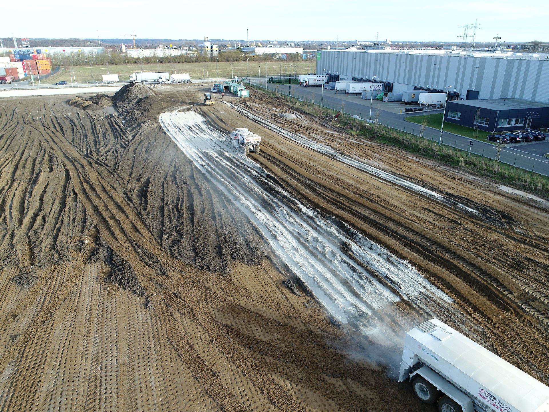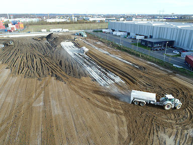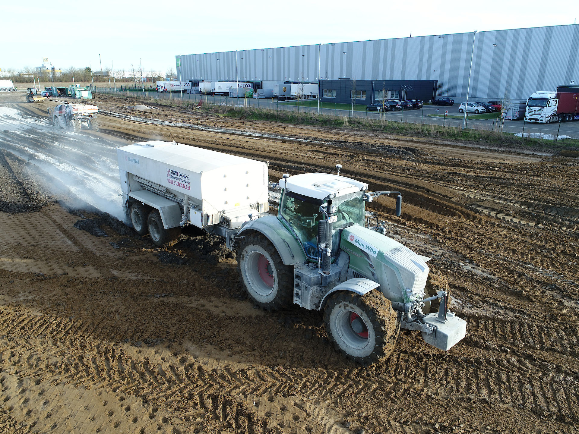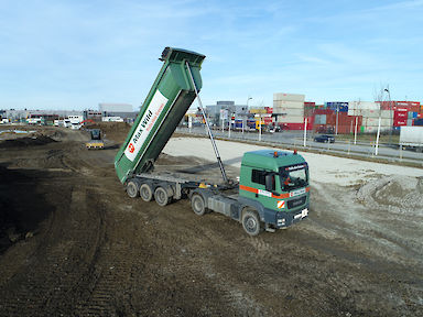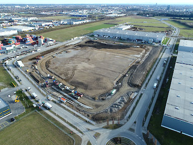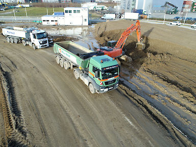Seit Mitte Dezember 2017 bearbeiten die Tiefbauspezialisten der Firma Max Wild das 6 Hektar große Grundstück in Gersthofen. Im Rahmen des Projekts gilt es insgesamt bis zu 30.000 Tonnen Humus abzutragen und abzufahren und circa 120.000 Tonnen Auffüllmaterial anzuliefern und einzubauen. Aktuell schreiten die Bauarbeiten trotz schwieriger Witterung zügig voran. Zunächst wurden die Erdmassen durch zwei Raupenbagger, zwei Schubraupen, Wirtgenfräse, Traktor mit Streuer sowie zwei Walzenzüge in Bewegung gebracht und abgetragen. Dabei fallen täglich bis zu 1.000 Tonnen Humus an, die von einem Kettenbagger mit einem Einsatzgewicht von 30 Tonnen auf die Lkw geladen werden. Täglich kommen beim Transport des Materials 50 bis 70 Lkw zum Einsatz. An der Erddeponie angekommen, wird die Ladung abgeladen und das für die Baustelle benötigte Auffüllmaterial auf die Lkw geladen. Eine besondere logistische Herausforderung sei, laut Bauleiter Locher, die Steuerung der Anlieferung und des Einbaus des Materials: „Täglich erwarten wir bis zu 4.000 Tonnen Materialanlieferungen. Bis Ende März sind das insgesamt 120.000 Tonnen Auffüllmaterial, die zur Baustelle gebracht und qualifiziert eingebaut werden, um nach erfolgtem Humusabtrag das Gelände auf die geplante Höhe zu bringen“, so Locher. Das ist allerdings nicht die einzige Besonderheit bei dem Projekt: Hinzu kommen die örtlichen Gegebenheiten der Baustelle. Mehrere am Bau beteiligte Gewerke arbeiten gleichzeitig auf dem Areal. Dies erfordert viel Abstimmung untereinander und festgelegte logistische Prozessabläufe, damit gewisse Bauabläufe reibungslos und ungehindert fortgeführt werden können. Mit im Leistungsumfang befinden sich Kanal- und Außenanlagenarbeiten. Die Verlegung der circa 2.500 Meter Kanalrohre DN 100 bis DN 800 startet voraussichtlich Mitte Februar 2018. Zwischen Baubeginn und Fertigstellung der Arbeiten durch die Firma Max Wild ist ein Zeitraum von sieben Monaten vorgesehen.