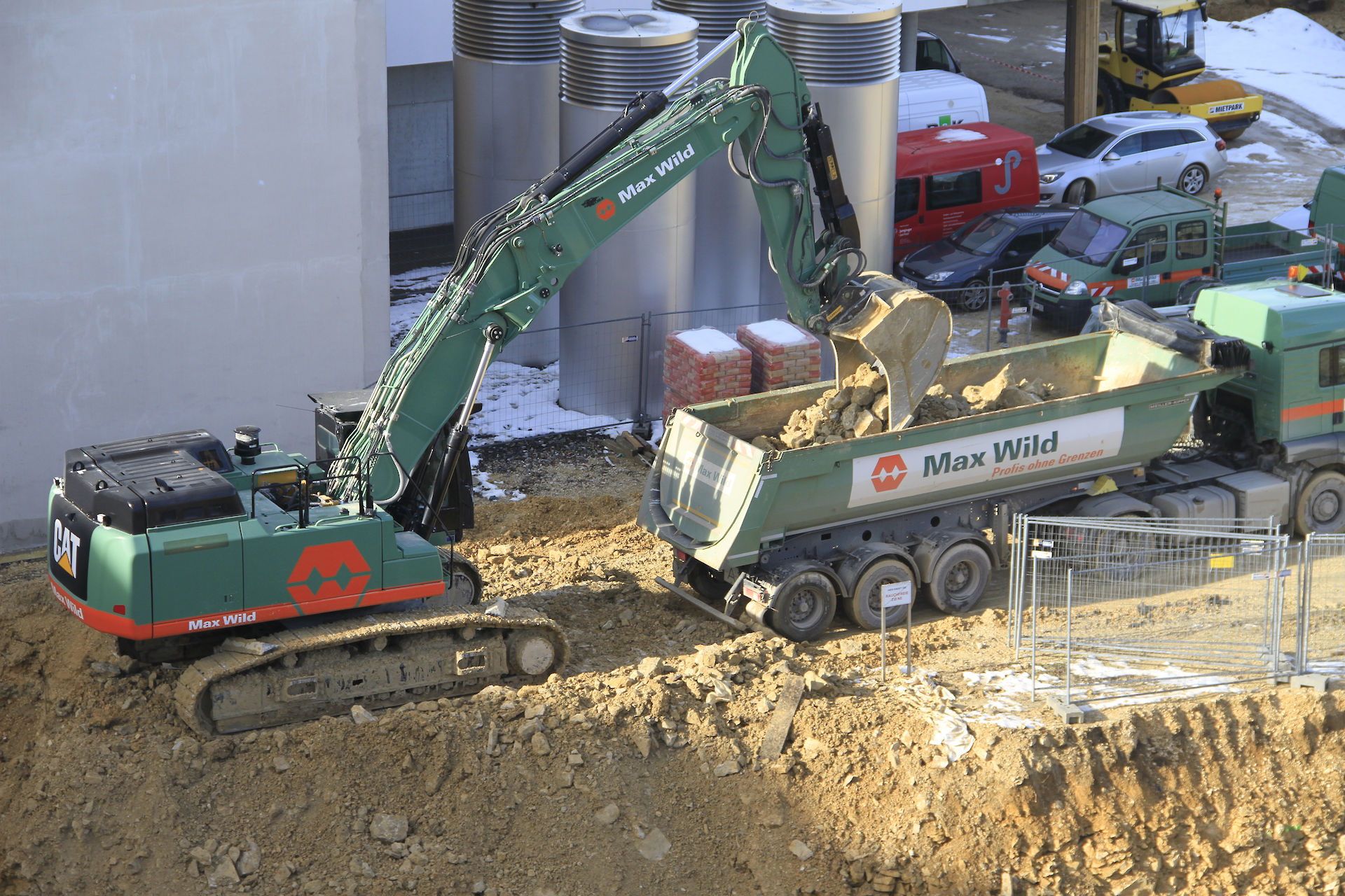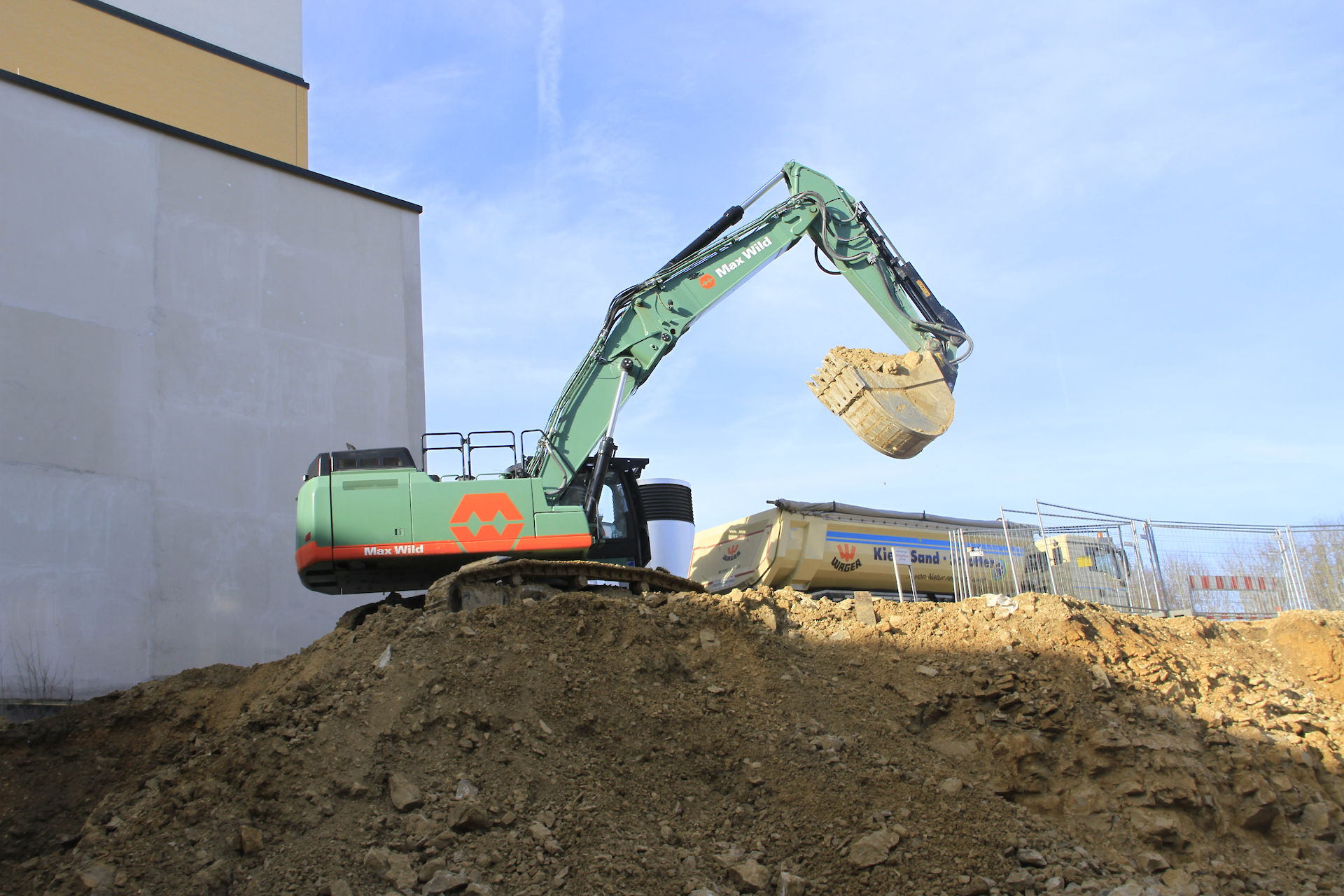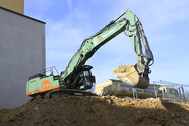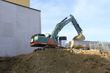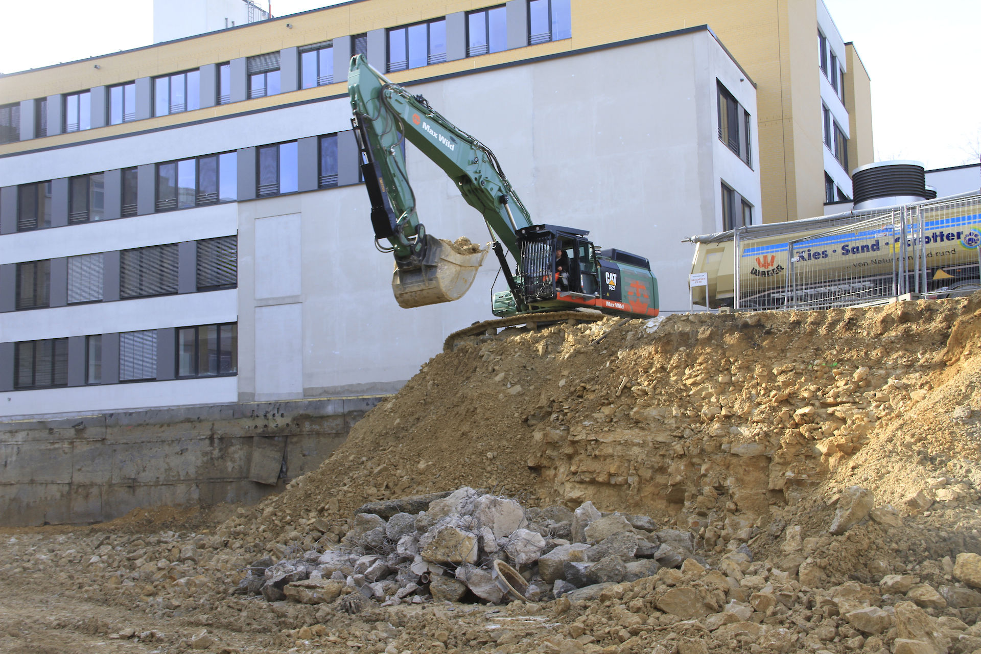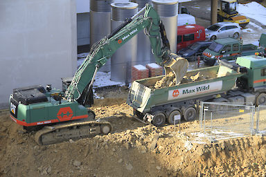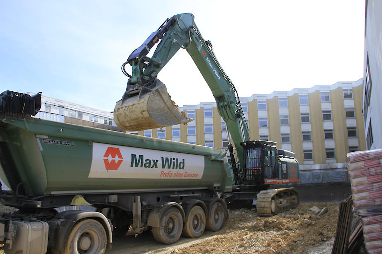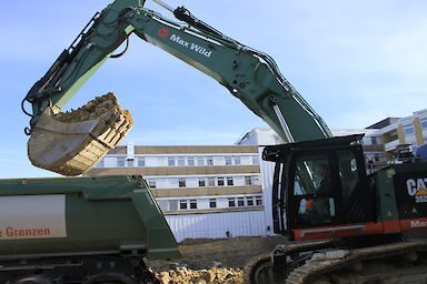 Bevor der Bagger auf der Baustelle zum Einreißen des 30-Jahre-alten Erweiterungsbaus anrücken durfte, musste das Gebäude fachgerecht entkernt werden. Binnen vier Wochen wurde der Gebäudekomplex komplett entkernt und im gleichen Zuge die Baustoffe sortenrein fraktioniert. Mitte September begann das Bauunternehmen Max Wild aus dem schwäbischen Berkheim mit dem ersten Baggerbiss den Abriss des Erweiterungsbaus. Stück für Stück wurde das Gebäude rückgebaut - Ende November 2017 war der Erweiterungsbau, bis auf die Kellerwände, von der Bildfläche verschwunden. Anschließend galt es den Schutt abzutransportieren bevor mit den Tiefbauarbeiten begonnen werden konnte. Bis die Baugrube die geplante Tiefe von sechs Metern erreicht hat, mussten circa 17.000 m³ Aushub einschließlich Fels ausgehoben werden. Wie Rainer Hartwig, Bauleiter der Firma Max Wild, mitteilte, war die größte Herausforderung der Aushub des Felsmaterials. Durch den Einsatz des leistungsstarken 50 Tonnen Baggers Cat 352, bekam der erfahrene Bauleiter und sein Team den Aushub des Felsmaterials allerdings gut in den Griff. Baggerschaufel für Baggerschaufel hob der 50 Tonnen Koloss insgesamt 10.000 m³ Fels aus. Täglich wurden bis zu 800 m³ Aushub von der Baustelle abgefahren. Mit der Herstellung einer Baugrubenabsturzsicherung waren die Bauarbeiten durch die Firma Max Wild abgeschlossen.