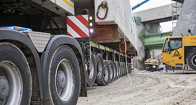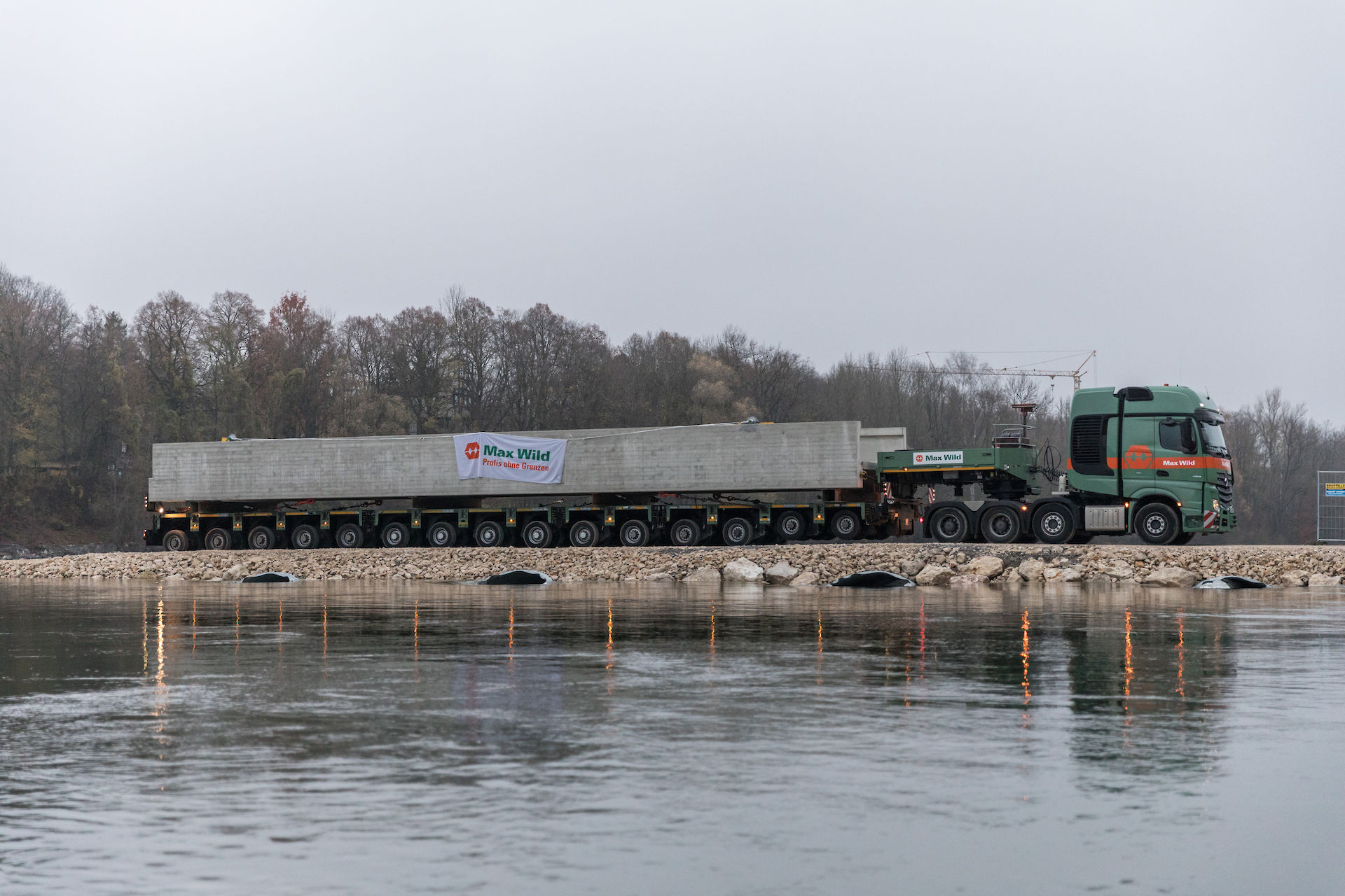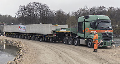 Das größte Segment wiegt 105 Tonnen und ist 22 Meter lang. Der benötigte Spezial-Lkw von Max Wild hat 19 Achsen und brachte mit Transportgut 180 Tonnen auf die Waage. Die Abmessungen und das Gesamtgewicht forderten eine Route mit Bundes- und Landstraßen, die keine Brückenquerungen aufweisen. Ein Vorabtrupp demontierte Verkehrsschilder und die Nachhut stellte den Urzustand auf der befahrenen Strecke wieder her. Besonders knifflig war die Zufahrt zur Baustelle am Hochablass. Die Straße ist mit Bäumen und Sträuchern gesäumt, die nicht beschädigt bzw. entfernt werden dürfen.