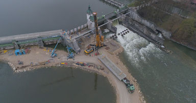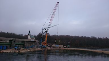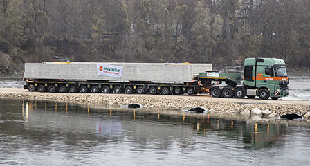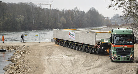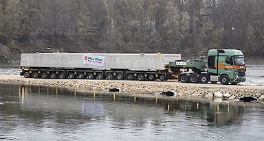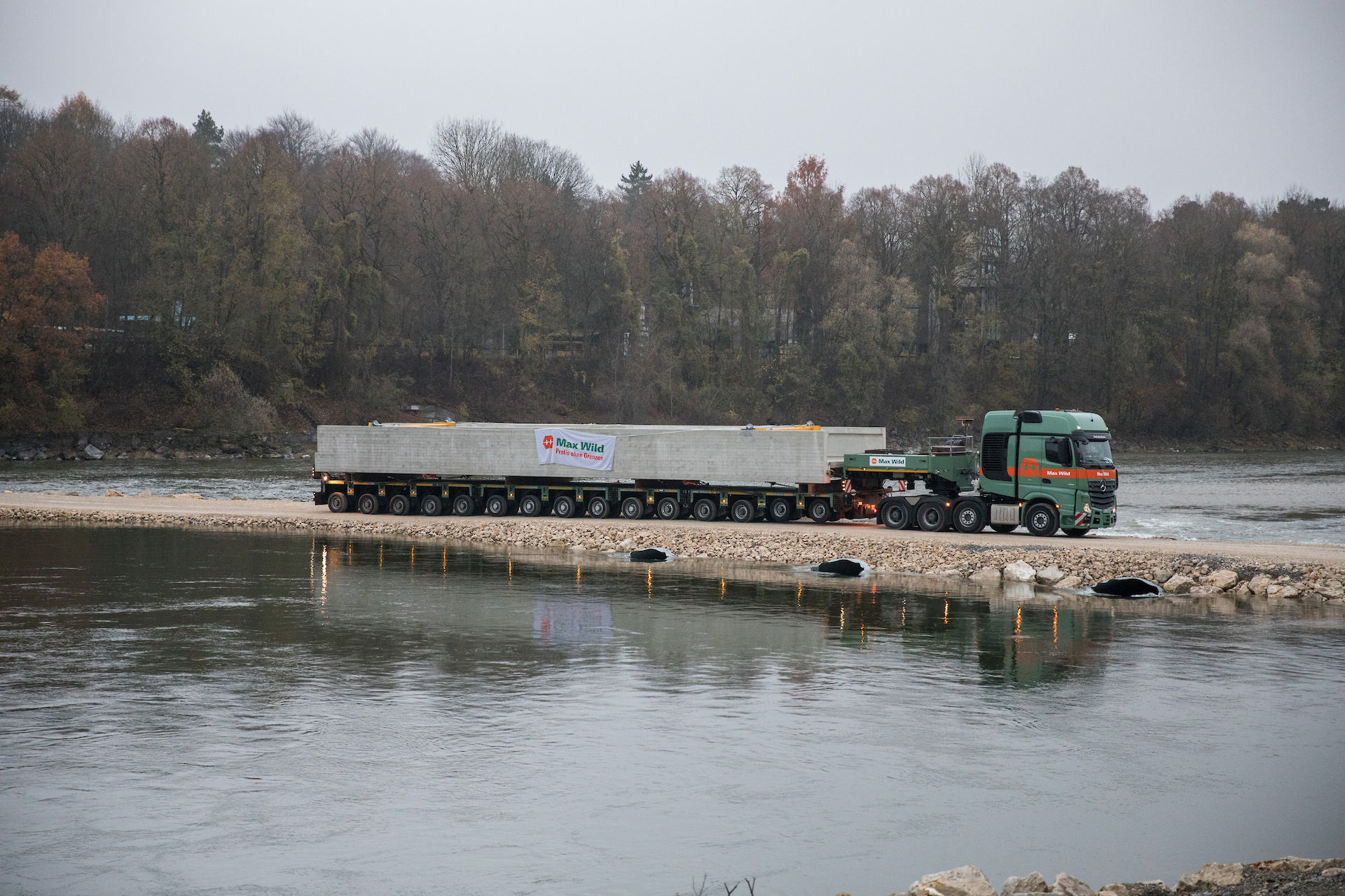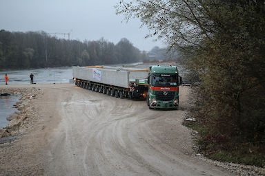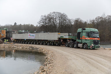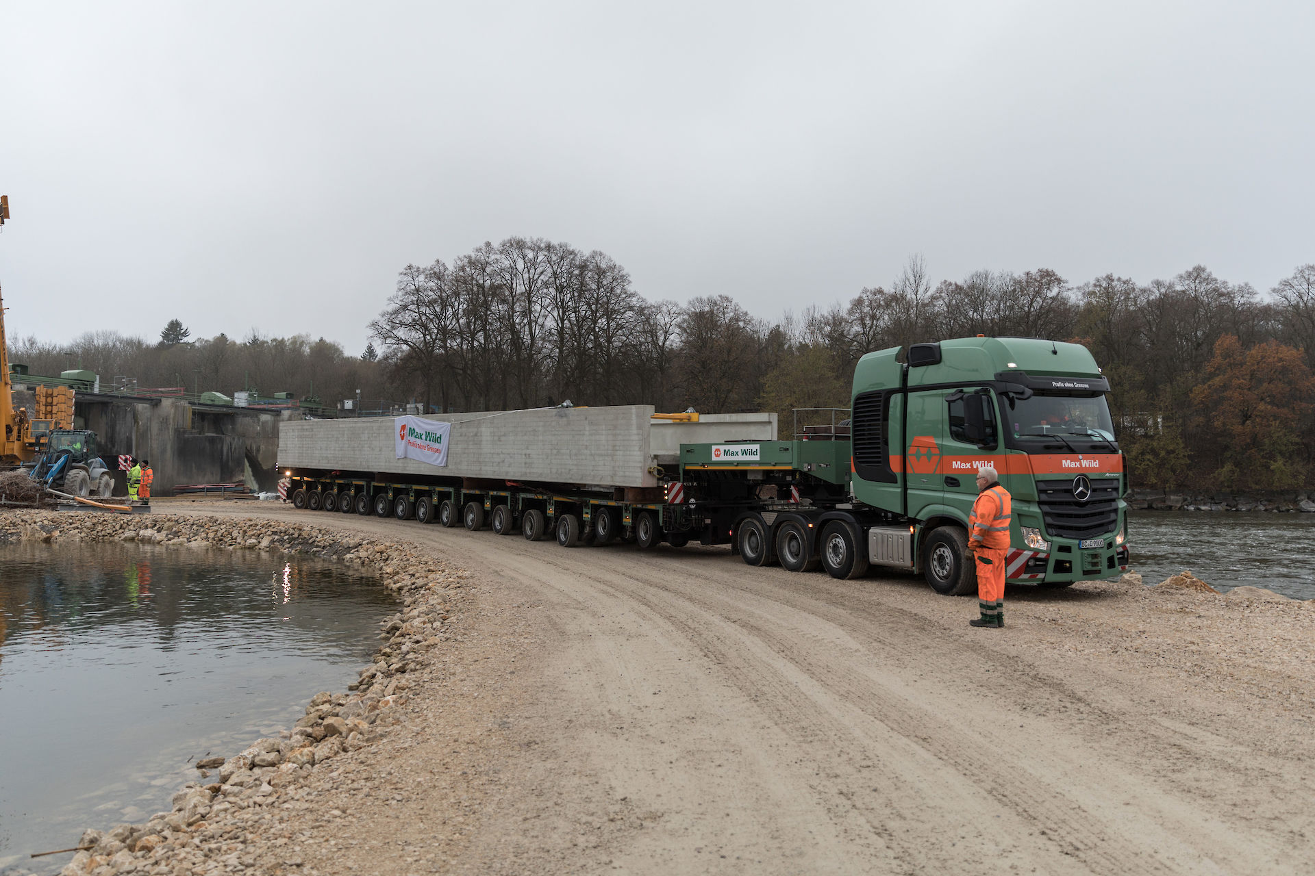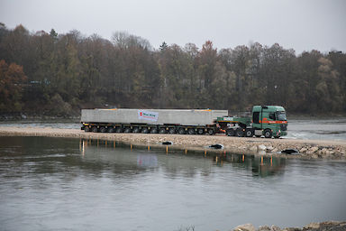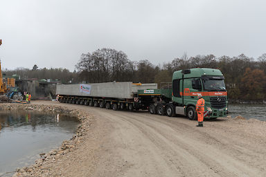 Um die Anlieferung und den Aus- und Einbau der Betonelemente und des Walzenwehres zu vereinfachen, wurde im Flussbett unterhalb des Hochablasses eine künstlich aufgeschüttete Baustraße eingerichtet. Unsere Logistikprofis überzeugten in eindrucksvoller Teamarbeit bei Planung, Routenauswahl, Verladung, Transport und Entladung. „Unser Team hat einen großartigen Einsatz gezeigt. Die Zusammenarbeit mit allen beteiligten Firmen und Behörden war top!“, so unser Projektleiter Joachim Riedmüller.