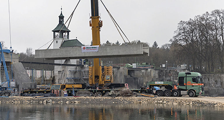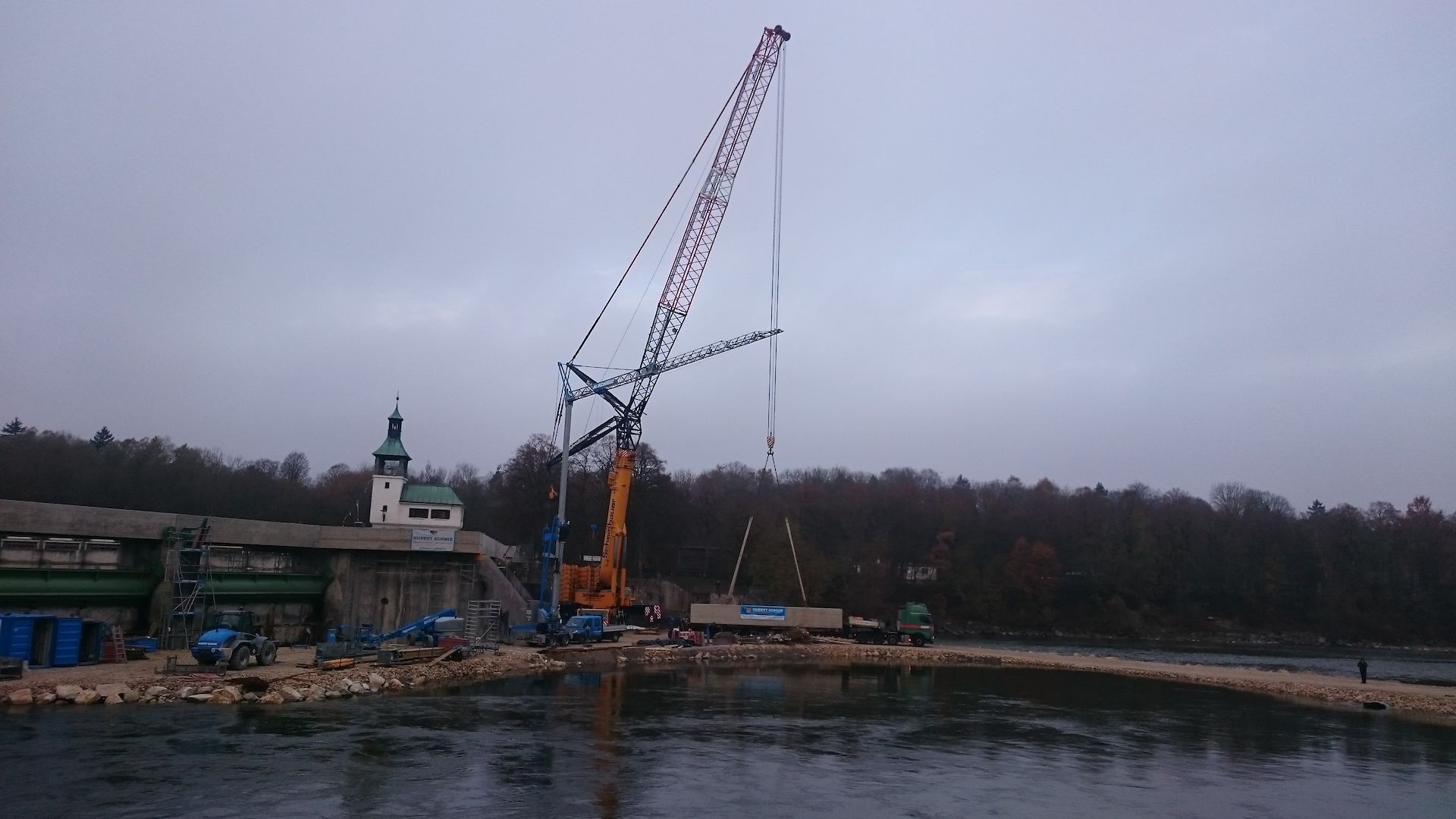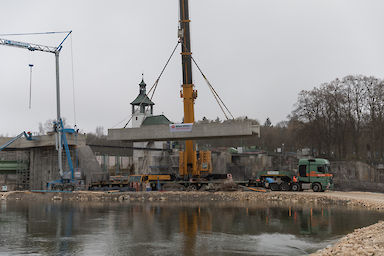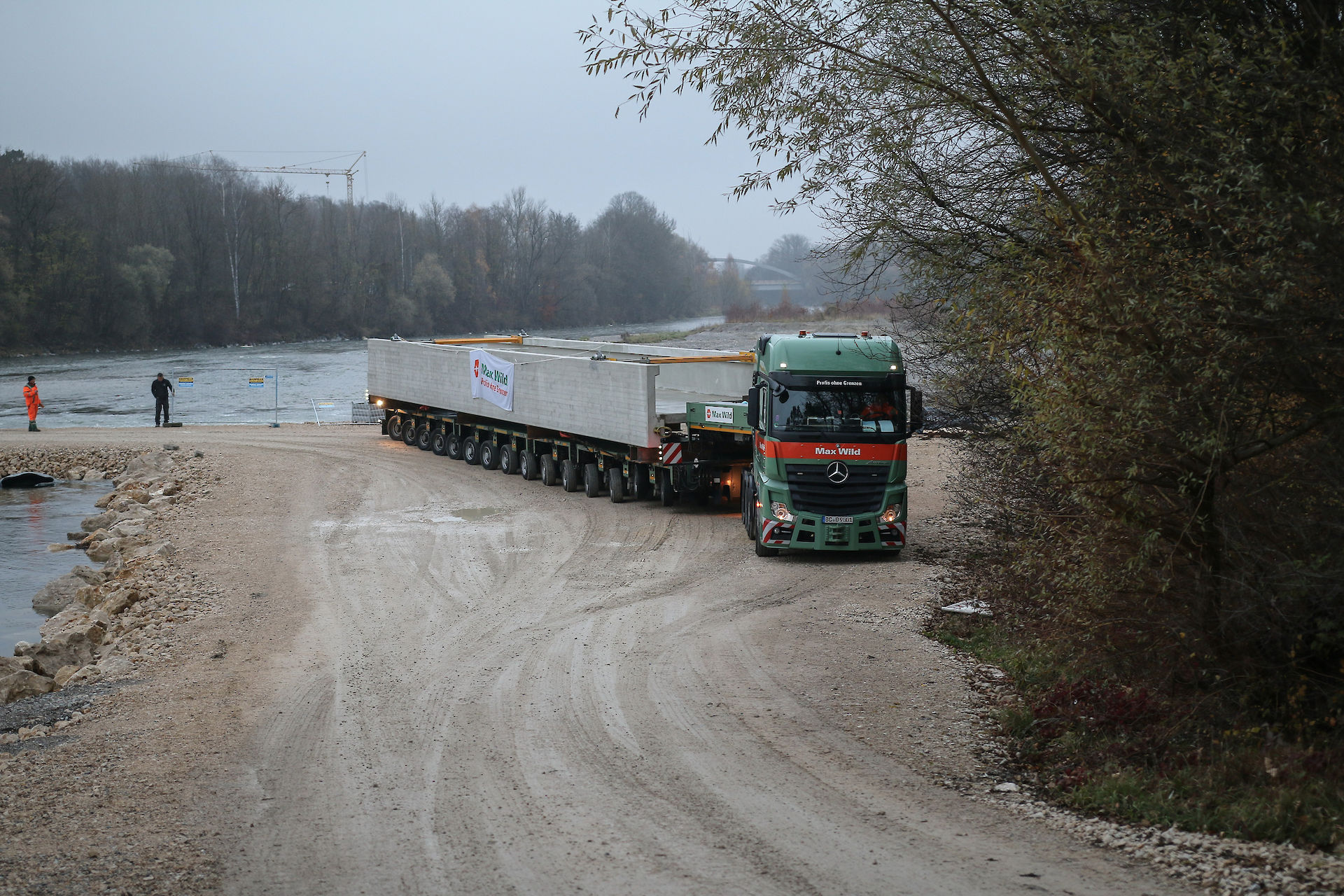 Am 16. November kam das größte Betonelement mit einem Gewicht von 105 Tonnen auf der Baustelle am großen Lechwehr an. Der Betonsteg über dem Hochablass muss erneuert werden und ist bereits seit Ende August gesperrt. Ein Spezialkran hat im September die alten Betonelemente entfernt. Anfang Februar soll die Brücke wieder passierbar sein.