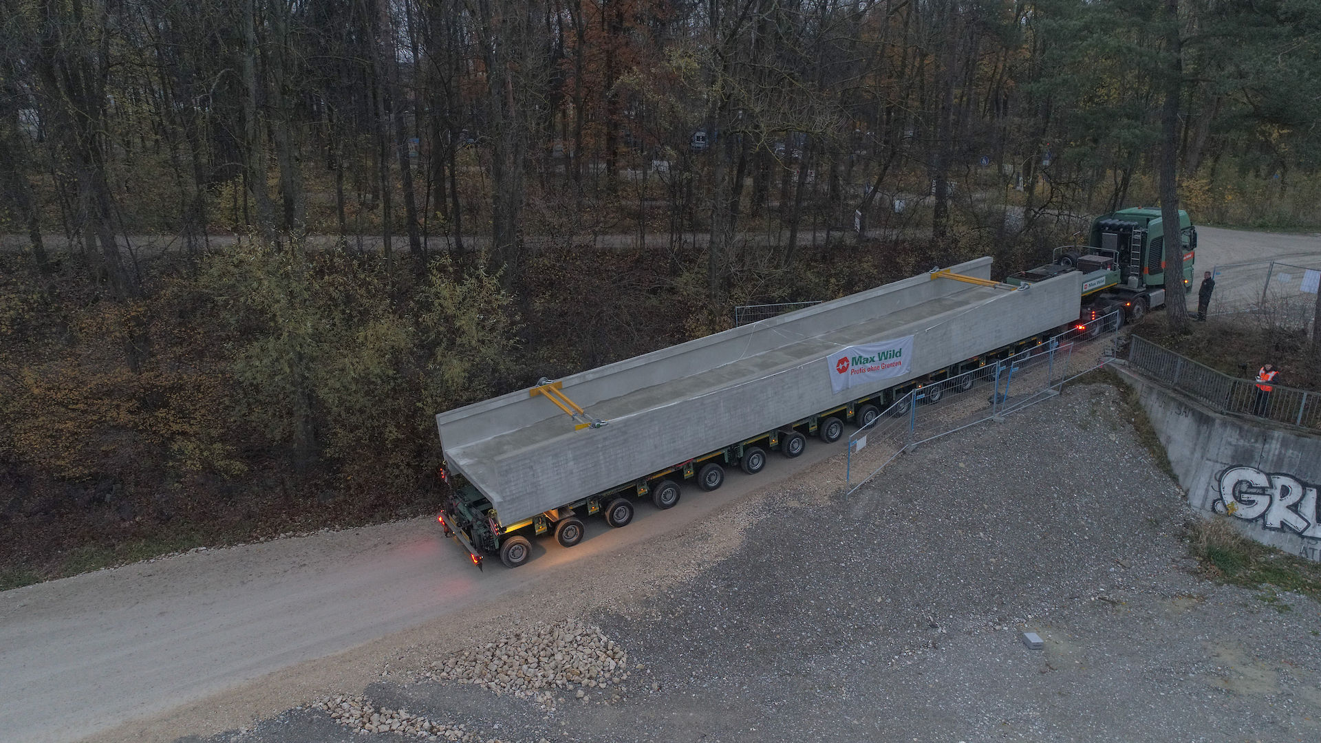 Unser Logistikteam transportierte jedes Betonteil aufgrund der großen Abmessungen und des hohen Gewichtes separat. Die Elemente wiegen zwischen 60 und 105 Tonnen. Geladen werden die Teilstücke der neuen Fußgängerbrücke in Marktoberdorf. Innerhalb von fünf Werktagen hat die Max Wild GmbH die sieben Teilstücke für den Betonsteg nach Augsburg zum Hochablass gebracht. Begleitet wurden die Schwerlastfahrzeuge von Polizei und einem Begleitfahrzeug zur Streckensicherung nach verkehrsrechtlichen Anordnungen.