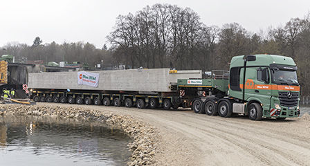 Sieben Betonteile für den Fußgängersteg transportierten unsere Logistikprofis von Marktoberdorf zum Hochablass im Augsburger Südosten.