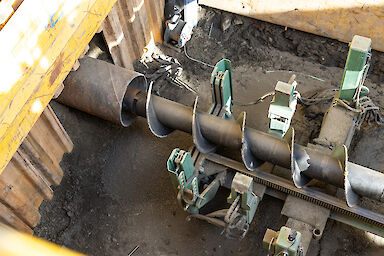 Für das Projekt wurden zwei Bohrungen mit insgesamt rund 300 m Länge ausgeführt. Zunächst entsteht eine 62 m lange Stahlrohr-Pressbohrung, in die anschließend ein Mediumrohr mit DN600 eingebracht wird. Daran schließt eine ca. 200 m lange Spülbohrung an, die präzise mit dem ersten Abschnitt verbunden wird. Höchste Genauigkeit ist dabei entscheidend, um Trasse und Gefälle exakt einzuhalten.