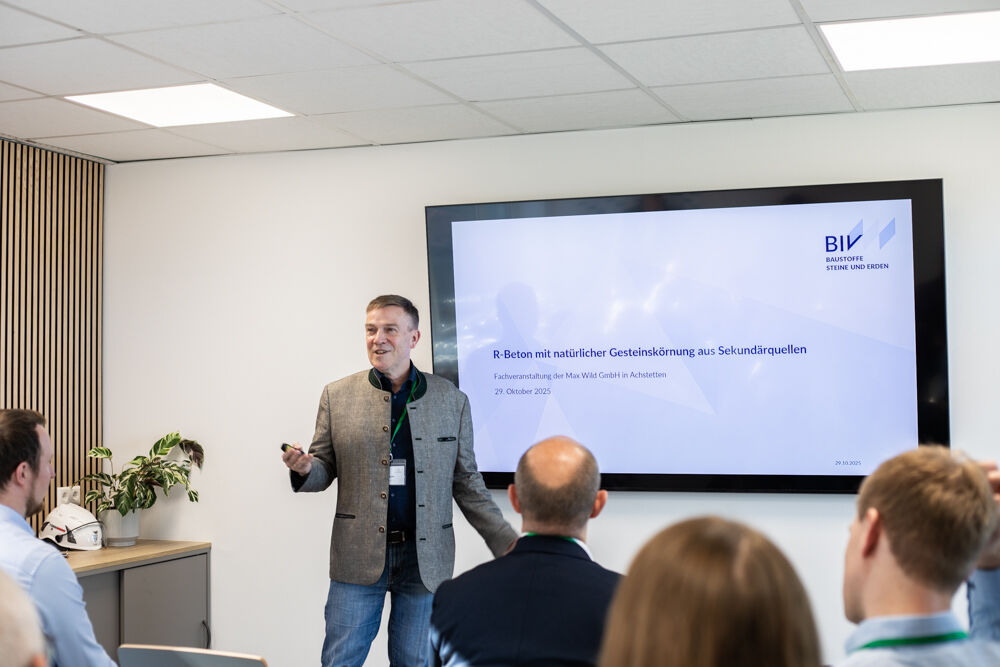 Nach den einleitenden Worten von Max Wild (Gesellschafter Max Wild GmbH) und Erik Schleicher (Gesellschafter SCHWENK), erhielten die Teilnehmenden einen umfassenden Überblick über das Projekt und die nächsten Schritte von Joachim Kainz (Leiter Kreislaufwirtschaft / Recycling SCHWENK) und Markus Wild (Geschäftsführer Max Wild GmbH). Zudem gab es einen spannenden Impulsvortrag von Herrn Dr. Bernhard Kling (Geschäftsführer Bayerischer Industrieverband Baustoffe, Steine und Erden e.V.) zum Thema Recycling-Beton.